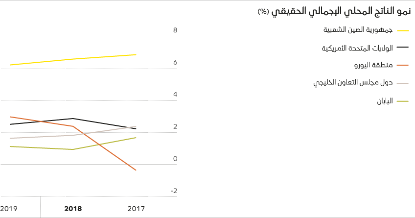 تشير التقديرات إلى أن الاقتصاد العالمي حقق نمواً بنسبة 3.7% خلال عام 2018، ويتوقع أن تصل النسبة خلال العامين 2019 و2020 إلى 3.5% و3.6% على التوالي وهو ما يمثل تراجعاً طفيفاً مقارنةً بالتوقعات السابقة، حيث فرضت الولايات المتحدة قيوداً تجارية على الواردات من الصين وبعض الدول الأخرى خلال العام 2018، وهو ما سيتبعه دون شك خطواتٍ مماثلة – ربما تكون قد بدأت بالفعل – من جانب الشركاء التجاريين. وقد أدت هذه التطورات إلى جانب عدم اليقين بشأن السياسات العامة إلى تراجع النمو. وتُرَجح كفةُ حالةِ عدم اليقين بشأن النمو المستقبلي كنتيجة للتوقعات السلبيةَ في هذا الصدد، بسبب المخاوف من تفاقم التوترات التجارية. ولا يزال خروج بريطانيا من الاتحاد الأوروبي دون اتفاق يشكل تهديداً آخر يزيد من صعوبة الوضع القائم.