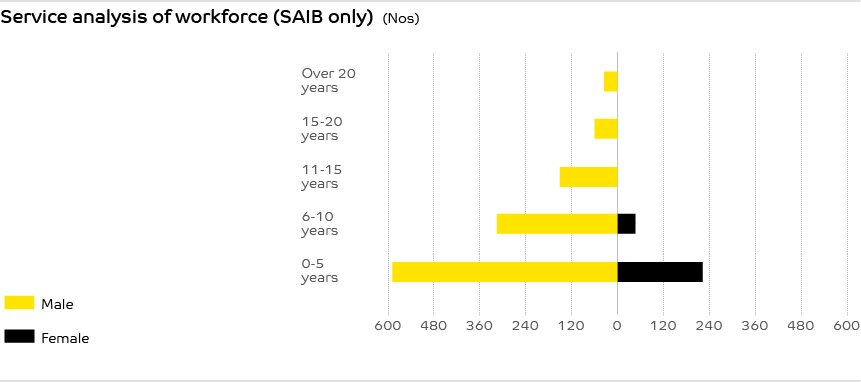 We seek to promote diversity in our workforce giving emphasis to growing the numbers of young people and women. The total number of permanent staff of SAIB only as at December 31, 2018 stood at 1,416. The female staff ratio has increased from 18.6% to 19.1% during the year and we are making every effort to grow the percentage.