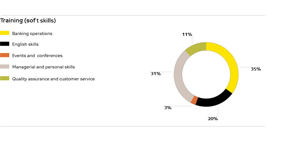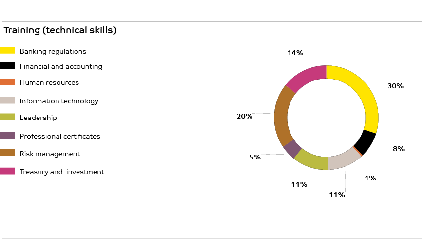 A total of 26,425 formal training hours has been provided to the staff of which 74.4% was for soft skills and 25.6% was for technical skills. The figures highlight the importance that is being given to soft skills. Of the employees who received training 25.0% were female, while females accounted for 32.8% of the total hours spent on training. The total number of participants in the training was 1,681. In addition to the formal training, the Bank has offered over 208 eLearning modules to its staff.